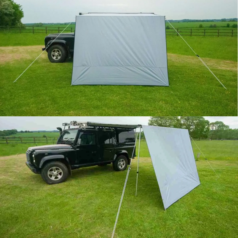The front wall for the vehicle side awning is a great accessory to provide protection from the elements. Whether it be from the sun, wind, rain or just a bit of privacy in camp. The wall fits into place via velcro straps along the top and eyelets in the bottom corners for pegging into the ground. The awning side wall is made of rugged 400D rip-stop polyester Oxford canvas which is waterproof, UV, and mould proof. Included with each wall are 2 x Heavy-duty 8mm diameter stainless steel pegs and a carry bag for the pegs.